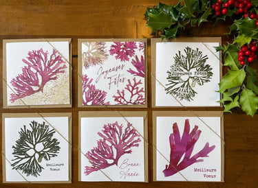 Des vœux festifs avec une touche marine ! Notre collection de Noël présente une gamme colorée d'algues rouges et vertes et des messages de vœux pour les fêtes de fin d'année.